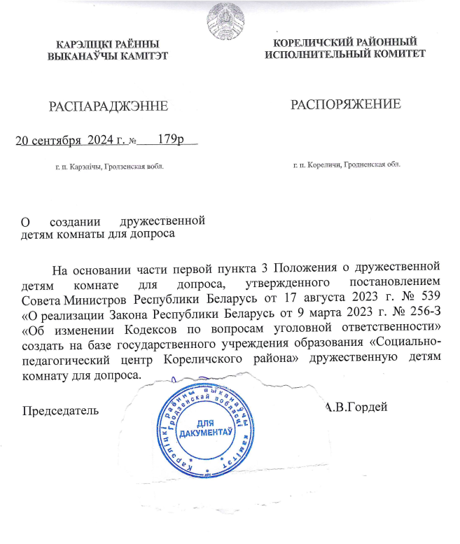 Нам базе социально-педагогического центра, на основании распоряжения председателя Кореличского районного исполнительного комитета, создана дружественная детям комната для допроса. Это специально оборудованное помещение, в котором органом, ведущим уголовный процесс, осуществляется допрос несовершеннолетних потерпевшего или свидетеля, не достигших шестнадцатилетнего возраста, по уголовным делам о преступлениях против личной свободы, чести и достоинства, жизни и здоровья, половой неприкосновенности или половой свободы.